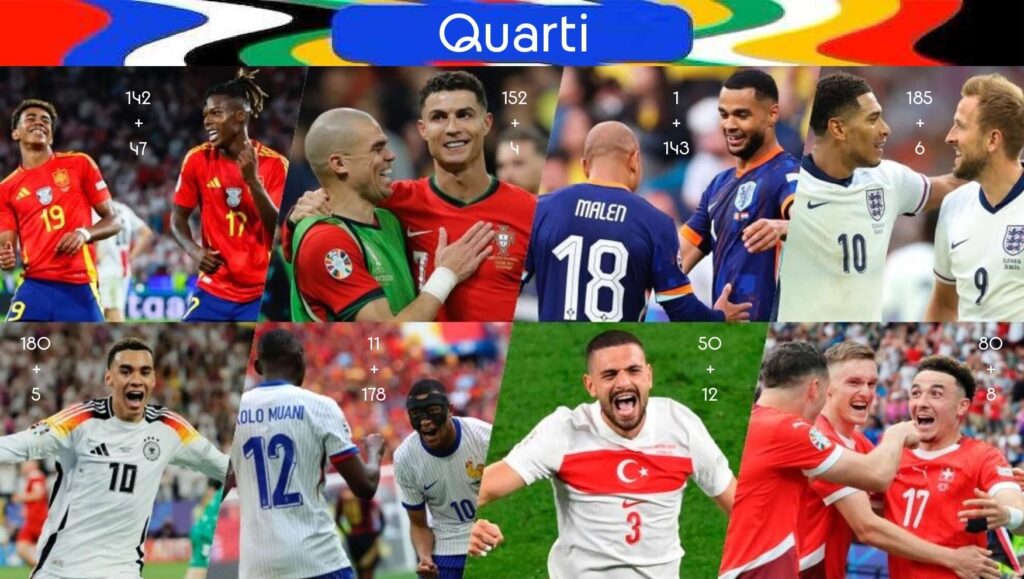 L’Inghilterra è in assoluto la più pronosticata, anche più della Germania padrone di casa, mentre per la Spagna alcuni hanno pensato che potesse finire dall’altra parte del tabellone; qualcuno in meno, ma pure sempre oltre la maggioranza, ha dato fiducia al Portogallo; discorso a parte meritano la favoritissima Francia che ha scombinato totalmente la composizione del tabellone in cui undici temerari l’hanno spinta sin qui nella giusta posizione, ancor più roboante è la posizione dell’Olanda, prevista da un solo giocatore in quell’esatta casella dei quarti, complimenti davvero a chi ha osato. In ultima analisi ci sono le relative sorprese di Svizzera e Turchia che riscontrano comunque un buon indice di gradimento.