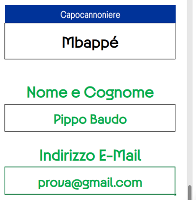 Per concludere bisognerà compilare gli ultimi campi che non sono dotati di menu a tendina, ma andrà scritto liberamente il nome del giocatore Capocannoniere, il proprio Nome e Cognome e l’Indirizzo E-Mail (esempio in immagine 9).