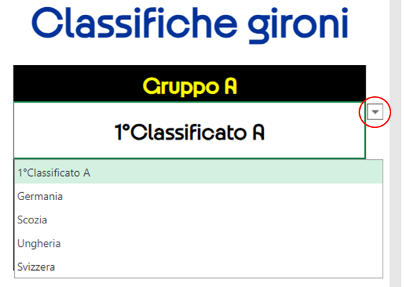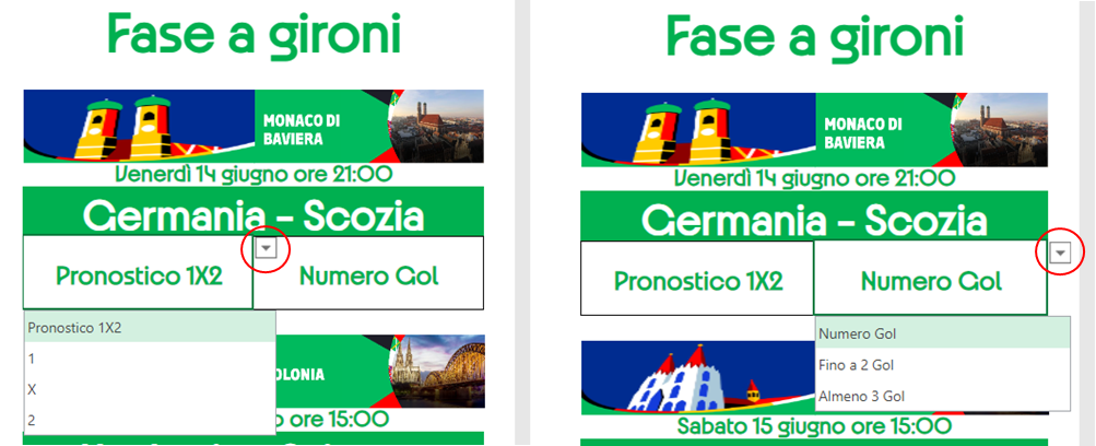 Nella prima parte riguardante la Fase a gironi bisogna cliccare sulle celle contenenti “Pronostico 1X2” e “Numero Gol”. Apparirà un piccolo quadratino con un triangolino che abilita il menu a tendina per scegliere il proprio pronostico (vedi Immagini 1 e 2).