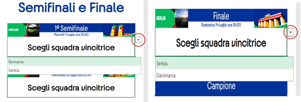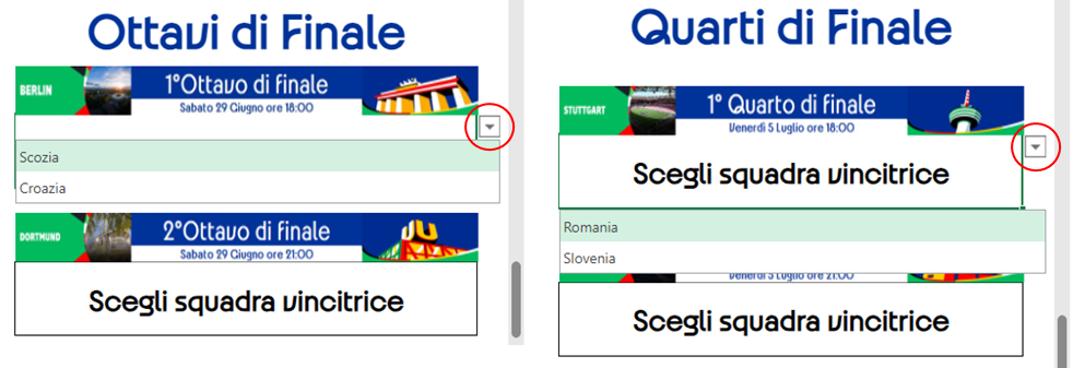 A questo punto si potrà procedere alla fase ad eliminazione diretta degli Ottavi di Finale, Quarti di Finale, Semifinali e Finale, dove andrà semplicemente pronosticata la squadra vincitrice dell’incontro (vedi esempi in Immagini 5, 6, 7, 8).