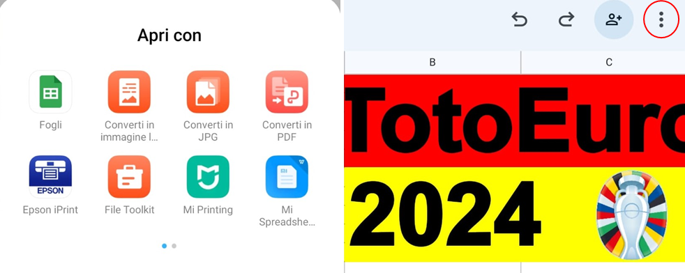 Scegliere l’applicazione per aprire il file (esempio applicazione “Fogli” in Immagine 14). Una volta aperto il file cliccare sui tre puntini in alto a destra (Immagine 15).