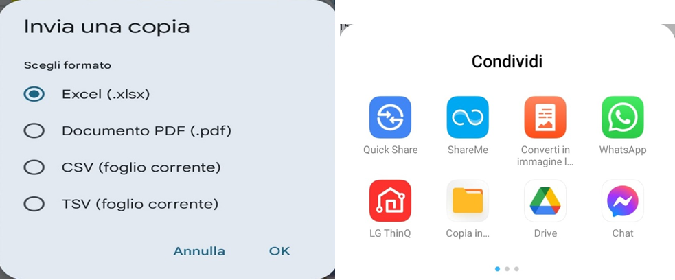 Scegliere il formato Excel (Immagine 18) ed inviare il pronostico tramite una delle applicazioni presenti sul proprio smartphone, es.Mail o Facebook Messenger (Immagine 19).